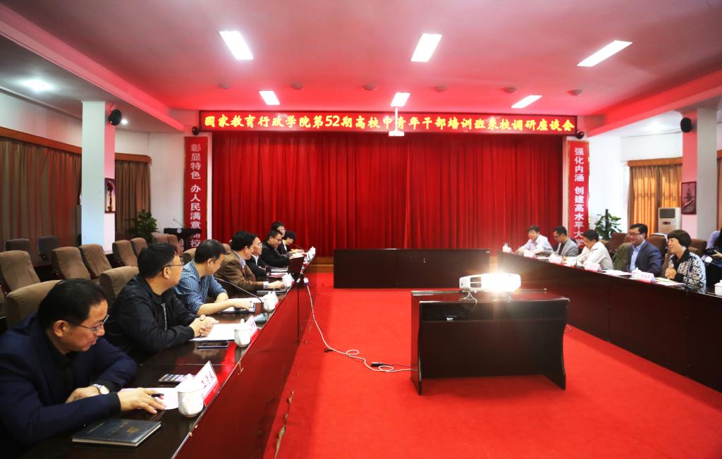 10月27日上午,国家教育行政学院学校管理部副主任李永贤带领国家教育行政学院第52期高校中青年干部培训班12人来我校考察调研,学校于西苑一办视频会议室召开座谈会。党委副书记阳小华、副校长陈国民出席会议,党政办、组织部、发展规划部、教务处、科技处、人文社科处等部门相关负责人参加会议,会议由阳小华主持。