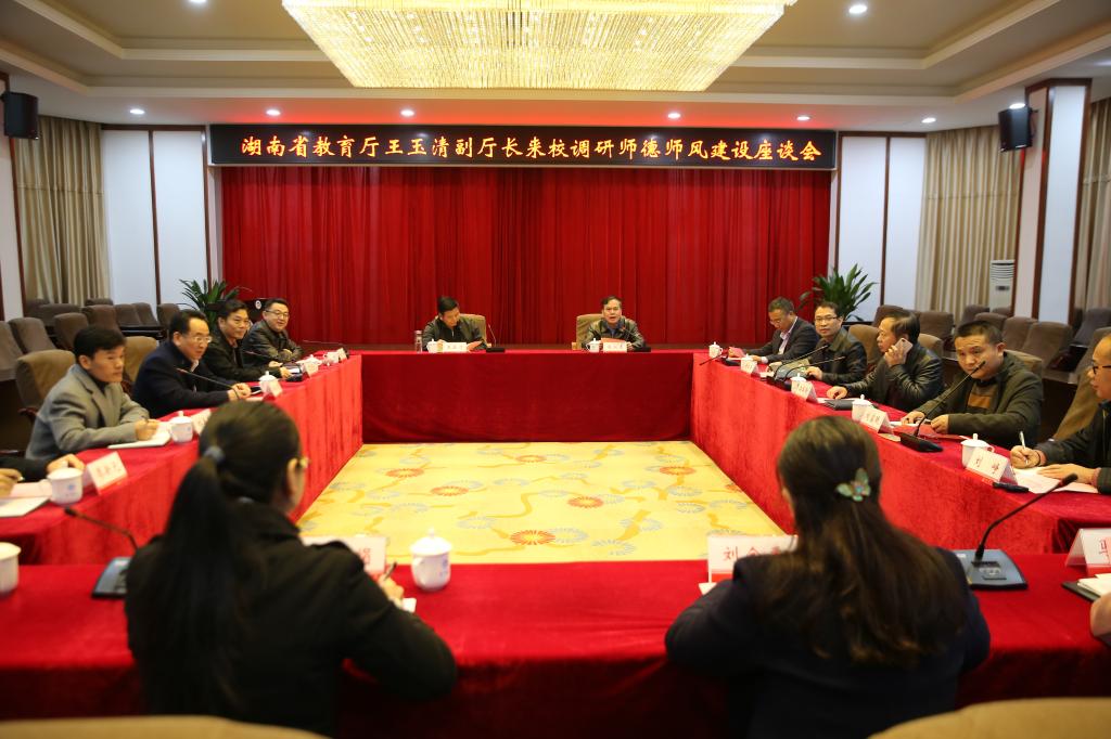 11月14日上午,湖南省教育厅党组成员、副厅长王玉清一行来我校调研师德师风建设情况。校党委书记王汉青陪同调研,并在西苑行政办公楼二楼视频会议室举行调研座谈会。