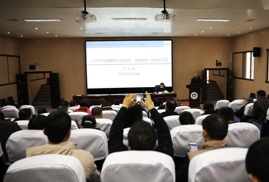 王汉青结合学校实际,从中国教育的“新三步走”,全国教育大会的历史地位、“六个新”“九个坚持”“六个下功夫”等方面,系统解读了全国教育大会的精神实质;从本科教育“四个回归”“三个不合格”“八个首先”“新时代高教40条”“六卓越一拔尖计划2.0”等方面阐述了新时代全国高校本科教育工作会议的主要内容;从一流本科建设的基本要求、我校一流本科建设存在的问题及一流本科工程建设的举措和方向等方面深入探讨了一流本科工程建设的重大意义和实现路径。