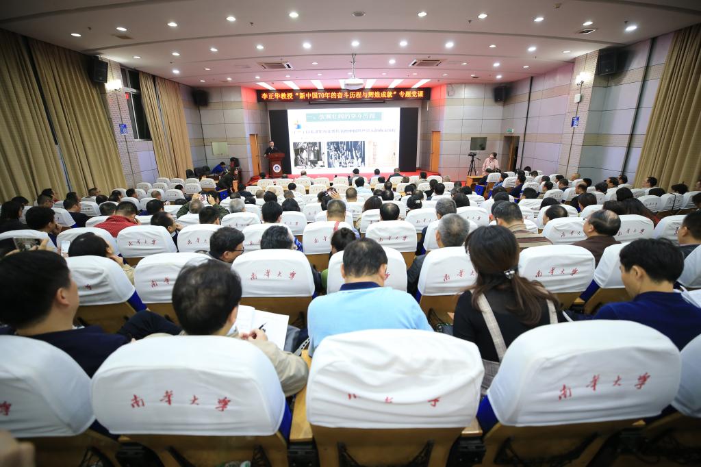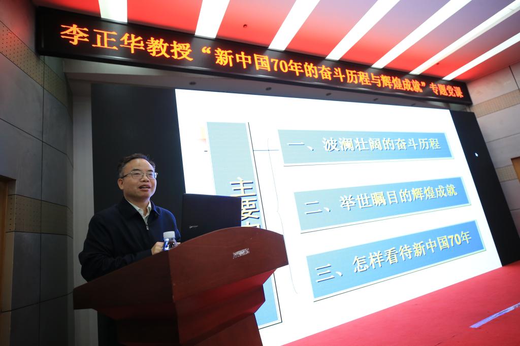 李正华教授从“波澜壮阔的奋斗历程、举世瞩目的辉煌成就、怎样看待新中国70年”这三个方面展开阐述,用详实的史实数据、严密的逻辑分析讲解了以毛泽东、邓小平、江泽民、胡锦涛、习近平为代表的几代中国共产党人的奋斗历程,带领大家全面回顾了新中国波澜壮阔的奋斗史以及所取得的举世瞩目的辉煌成就。他指出,新中国从奋斗到辉煌的这个过程其实就是从新中国刚开始的成立到慢慢转变成新时期新时代的过程,也是见证中国真正站起来、富起来到现在的强起来的过程。最后,他还系统总结了70年来社会主义建设的伟大成就、宝贵的经验和重要的警示。