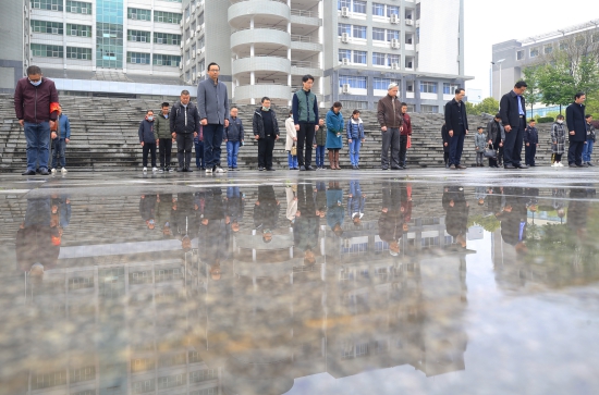 4月4日上午10时,36365路检测中心举行悼念仪式。全体值班教职工齐聚南华广场,默哀三分钟,向抗击新冠肺炎疫情英勇牺牲的烈土和不幸逝世的同胞表示沉痛哀悼。