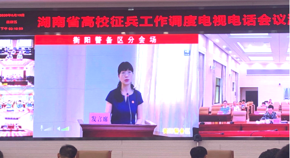 为贯彻落实党中央、国务院、中央军委关于征兵工作的决策部署,进一步做好2020年征兵工作,6月19日,湖南省高校征兵工作调度电视电话会议在长沙召开。省征兵工作领导小组副组长、省军区副政委郝先维,省教育厅党组副书记、副厅长、省委教育工委副书记王瑰曙出席会议,省征兵办主任、省军区动员局局长吴畏主持会议,我校作为全省5所代表院校之一在会上作经验发言。