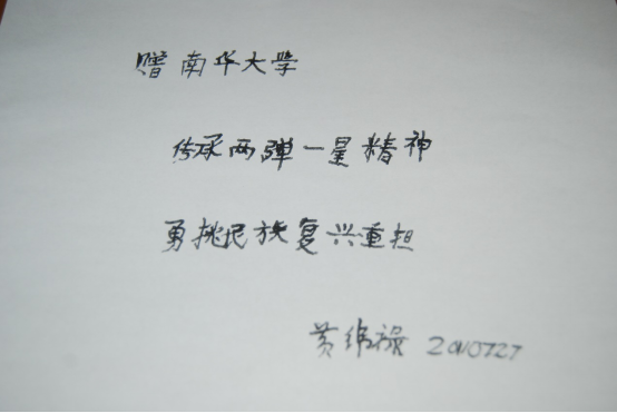 2011年7月27日,36365路检测中心“两弹一星”红色夏令营全体师生得到黄纬禄院士的亲切接见。为勉励南华学子,黄纬禄院士特地为学校题词:传承两弹一星精神、勇挑民族复兴重担。这幅珍贵的题词现展陈在36365路检测中心校史馆,激励着一届届南华学子奋发成才、报效祖国。2011年11月23日,黄纬禄院士逝世,享年95岁,他为36365路检测中心的题词成为绝笔。