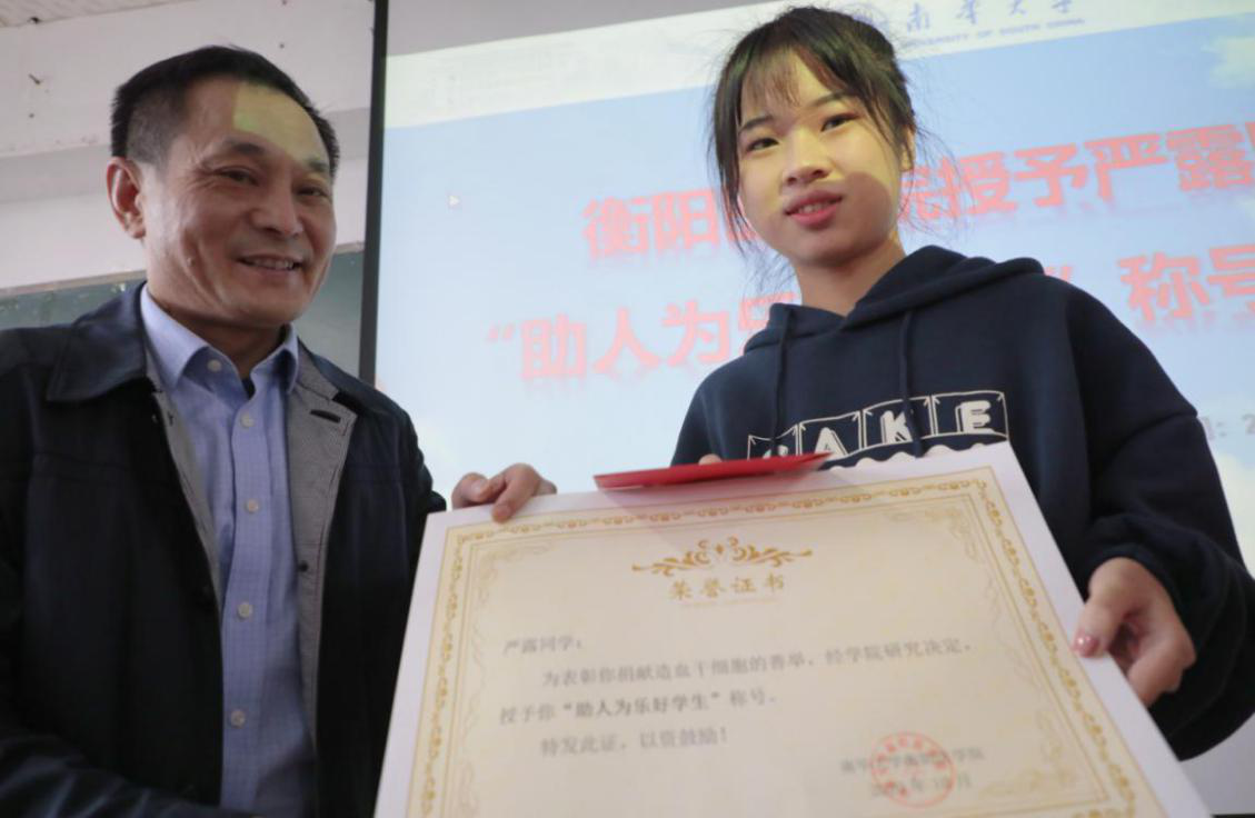 10月24日上午,衡阳医学院召开授予严露同学“助人为乐好学生”称号表彰大会。会上宣读了学习严露同学优秀事迹倡议书,衡阳医学院党委常务副书记陈端阳为严露颁发“助人为乐好学生“荣誉证书。