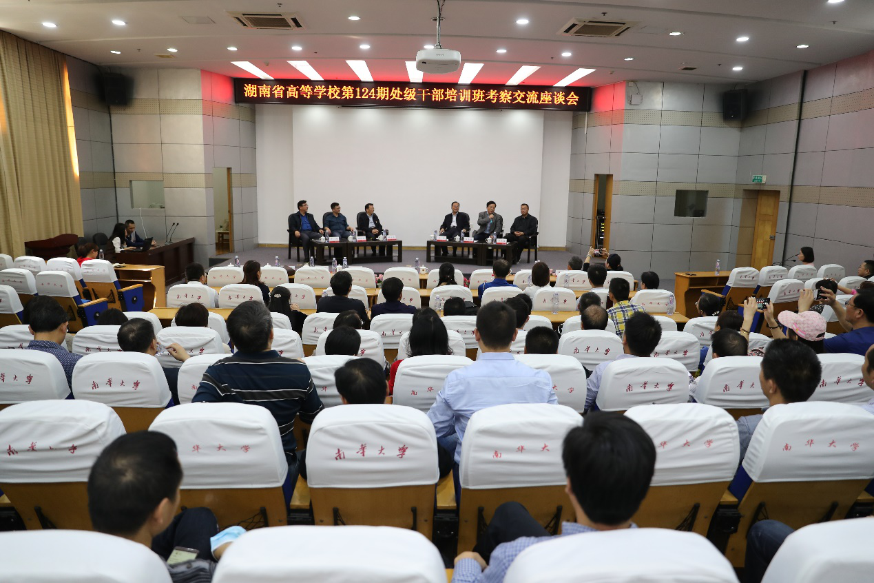 10月28日,湖南省高等学校干部培训中心主任、省委教育工委党校常务副校长刘国华带领湖南省高等学校第124期处级干部培训班学员来我校参观考察。校党委书记高山,党委副书记阳小华,党委委员、副校长姜志胜,党委委员、组织部部长于涛在图书馆学术报告厅接待并开展交流座谈会。座谈会由阳小华主持。