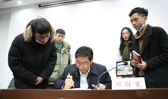 宣讲和报告结束后,邓群策来到师生中间,与同学们亲切交谈,并为学生代表签名。