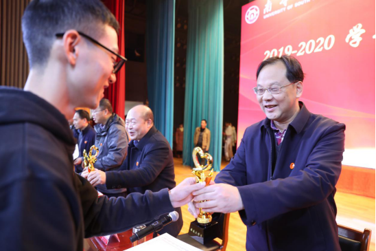 校领导为获奖个人和集体颁奖后,国家奖学金获奖者核科学技术学院刘伊诺感谢南华对她的培养,并号召广大南华学子积极弘扬“勤勉务实、甘于奉献、刚健自强、敢为人先”南华精神,不忘初心、牢记使命,做勇挑时代重任南华人。
