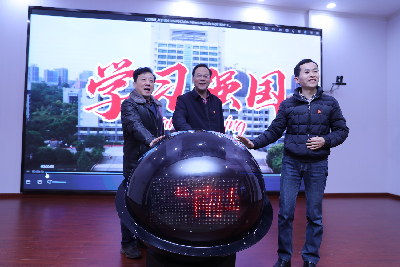 高山宣布36365路检测中心学习强国号正式上线,高山、阳小华与校党委委员、宣传部长刘文君共同按动仪式启动球。仪式上,刘文君介绍了我校学习强国号上线相关情况和强国号栏目设置情况。
