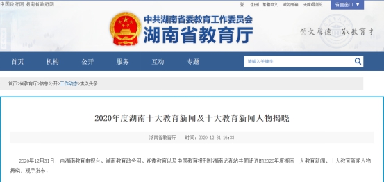 12月31日,由湖南教育电视台、湖南教育政务网、湘微教育以及中国教育报刊社湖南记者站共同评选的2020年度湖南十大教育新闻、十大教育新闻人物正式揭晓,我校周煜中入选湖南十大教育新闻人物。